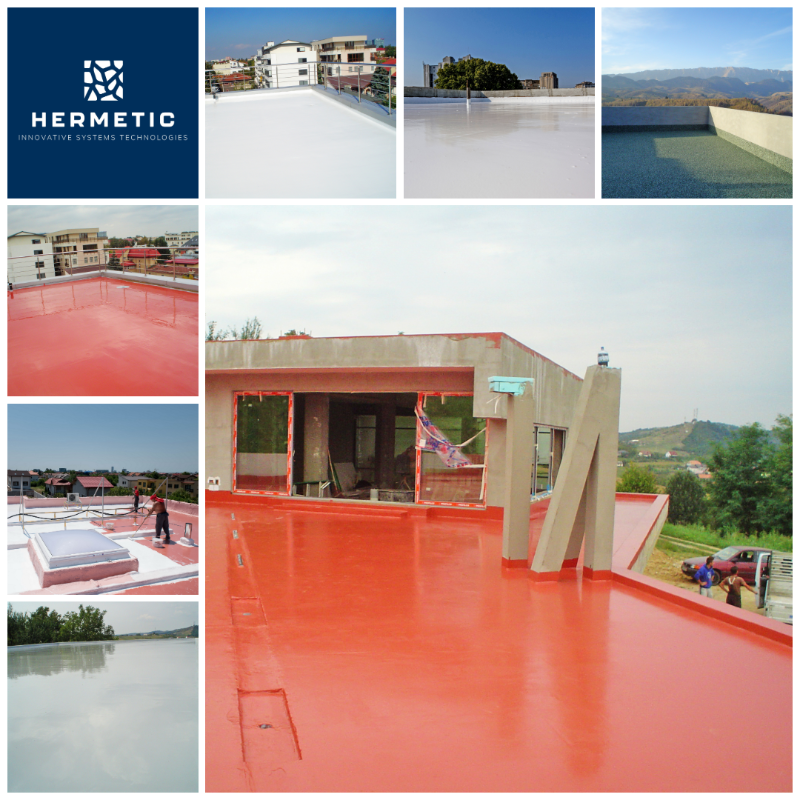 Membrana lichidă Hermetic Coat PU, principalul produs din componenta sistemului de hidroizolatii pentru terase Hermetic HBT este un material impermeabil care, odată aplicat, formează un strat continuu, fără rosturi sau îmbinări, prevenind astfel pătrunderea apei.