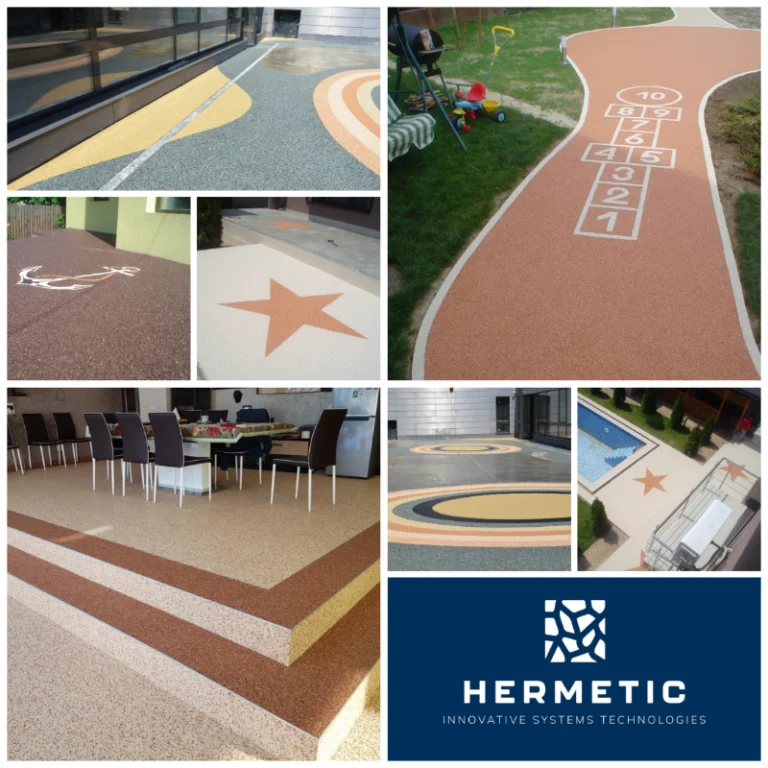 - Rășina se aplică pe stratul suport și apoi piatra se aplica deasupra – rezultă o textură mai aspră și total anti‐derapantă.