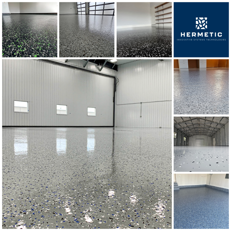 Sistemul pentru pardoseli epoxidice cu fulgi decorativi Hermetic asigura un ambient modern, intr o varietate foarte mare de culori si texturi cu finisaje lucioase sau mate.